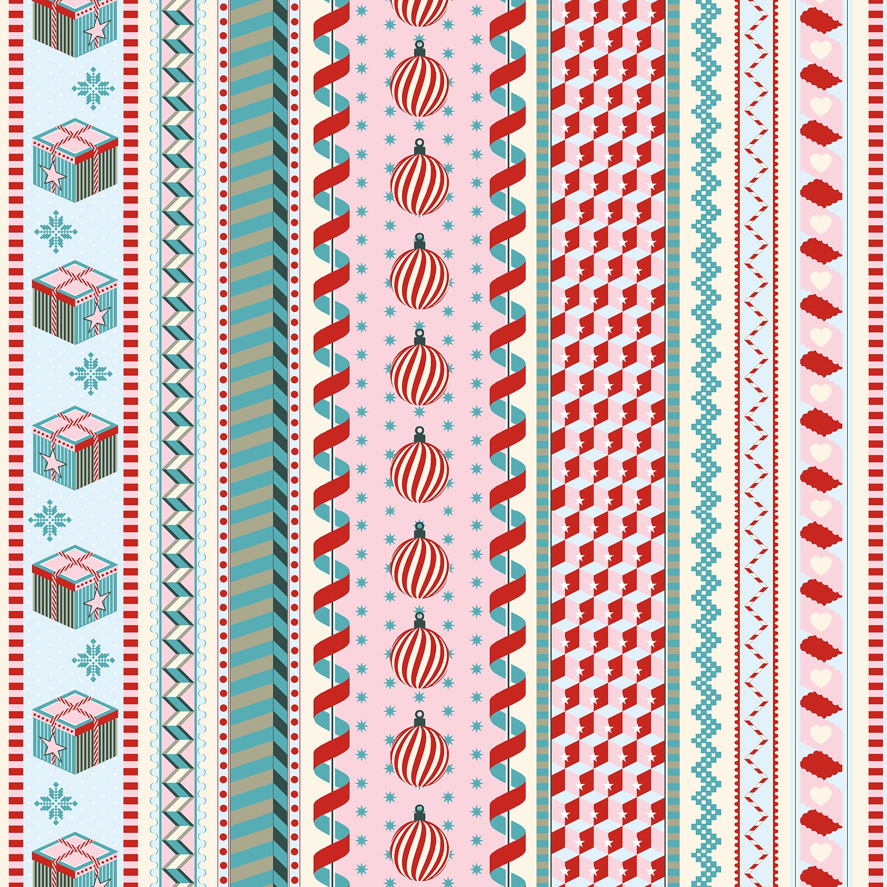 The design is like a classic Christmas wrapping paper with stripes of ribbons, baubles and presents in shades of red, green and pink..